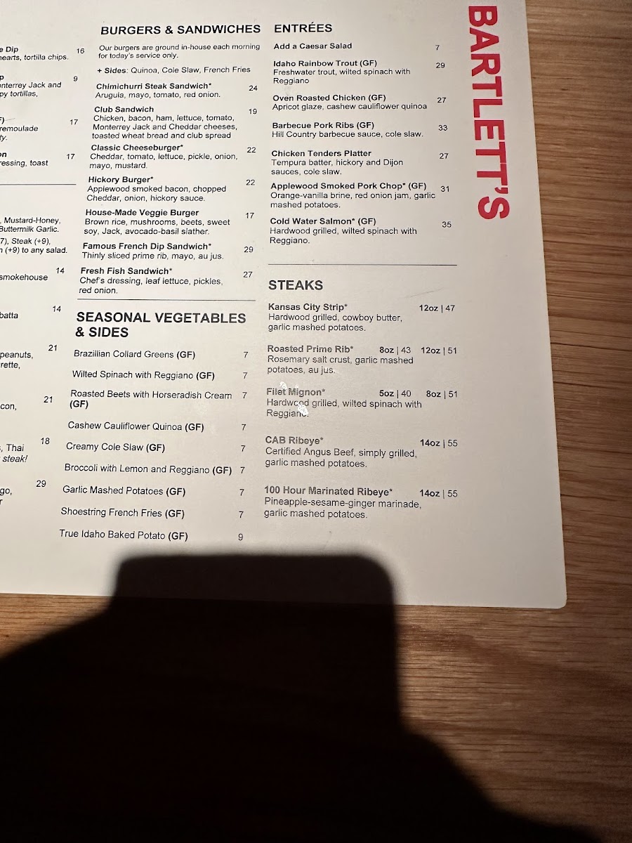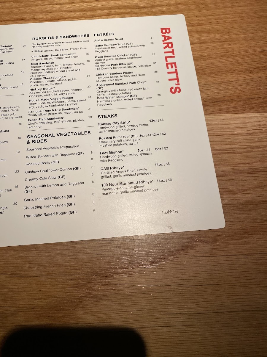 Bartlett's specializes in classic American fare, with a menu that showcases a mouthwatering selection of steaks, burgers, and sandwiches. Make sure to dive into their Hickory Burger—a delectable fusion of applewood smoked bacon and sharp cheddar, adorned with hickory sauce that dances on your palate, or the Classic Cheeseburger, which boasts perfectly melted cheddar and fresh toppings that elevate every bite for just $24. Seafood lovers should not miss the Fresh Fish Sandwich, a vibrant assembly of fresh ingredients dressed in a zesty chef’s dressing for $30. Whether you're craving a hearty lunch or a refined dinner, Bartlett's delivers culinary satisfaction with every dish.