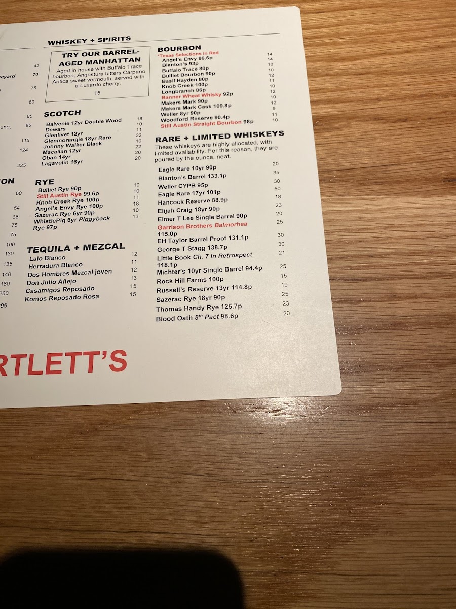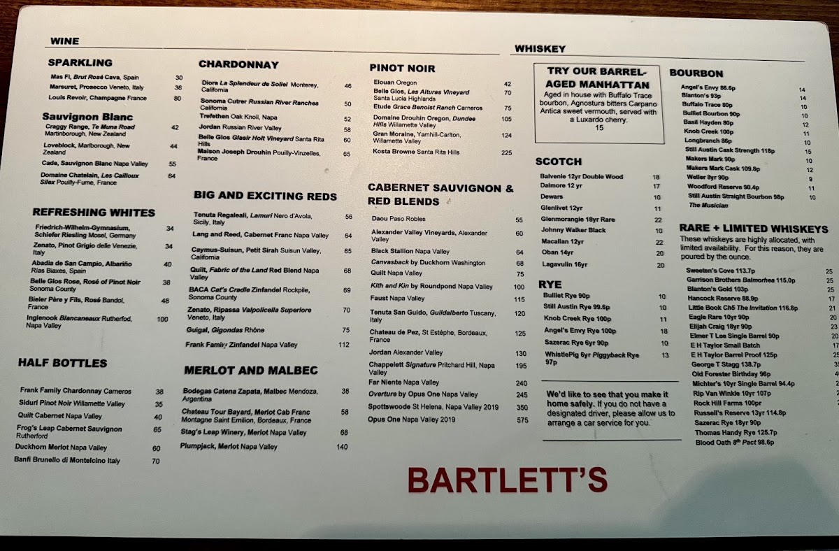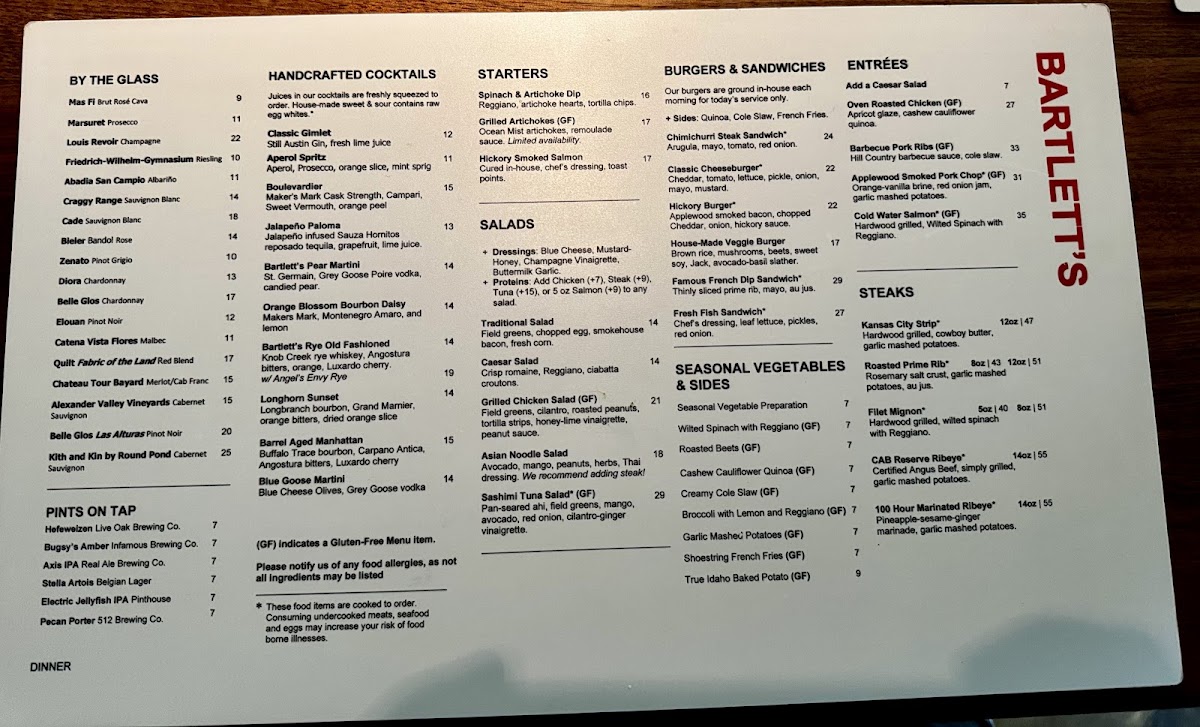 For those who appreciate a well-paired beverage with their meal, the bar at Bartlett’s is a destination in itself. From premium sparkling wines like Mas Fi Rose Brut to half bottles such as Duckhorn Merlot, bartenders are skilled at crafting delightful drinks that enhance your dining experience. Elva L. Arista noted, “This is one of my favorite restaurants in Austin, especially for a chilled martini, delicious steak & fine glass of wine,” showcasing the high standards at this establishment.